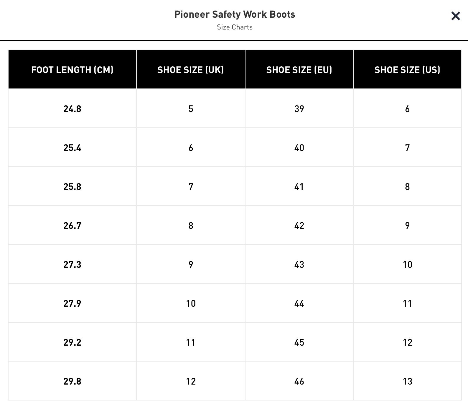 Pioneer Safety Work Boots: SIZE CHART