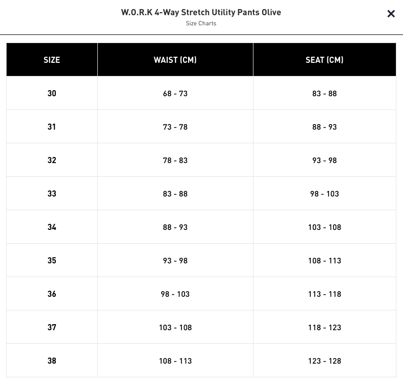 W.O.R.K 4 Way Stretch Utility Pants Olive: SIZE CHART