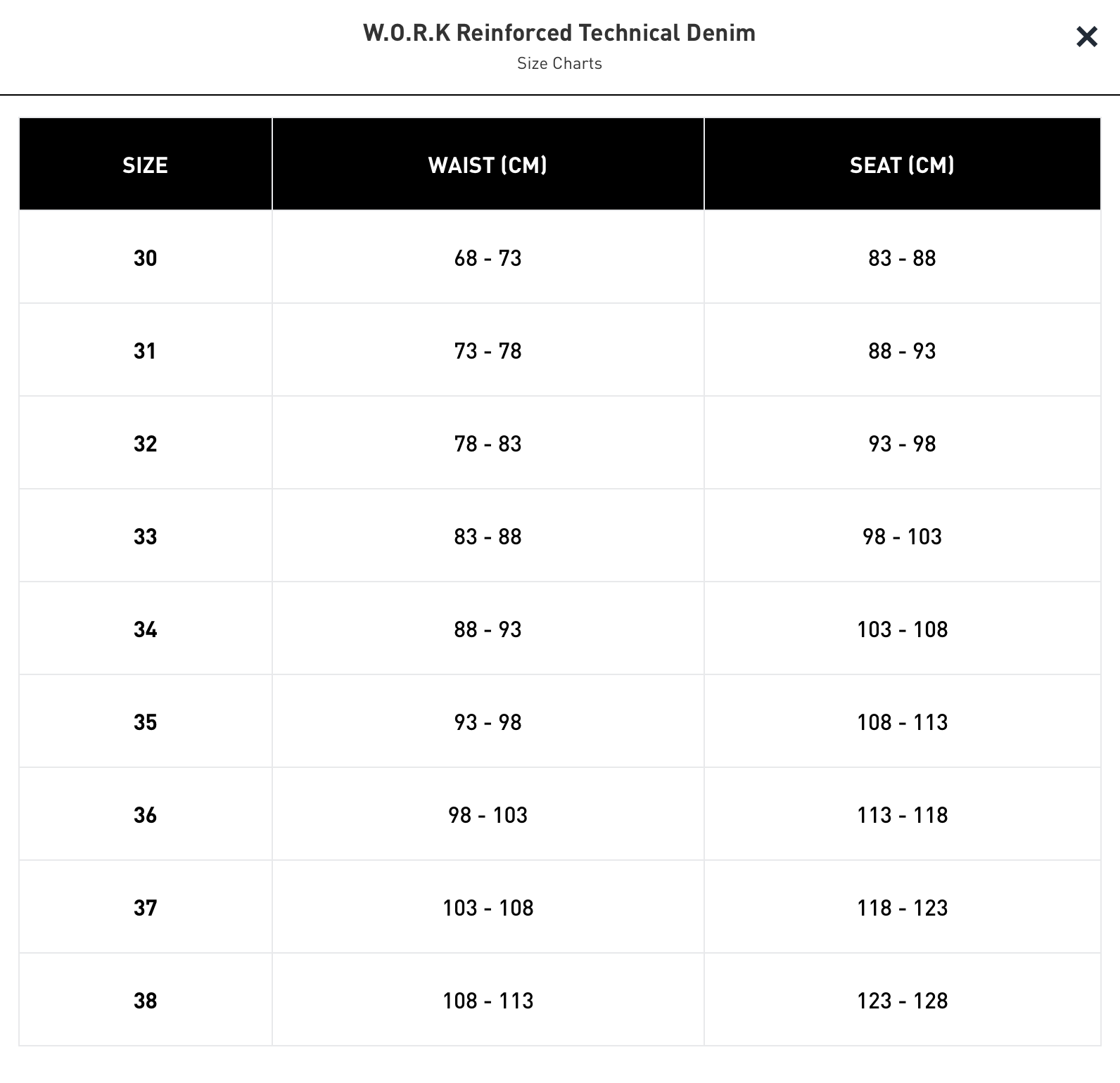 W.O.R.K Reinforced Technical Denim: SIZE CHART