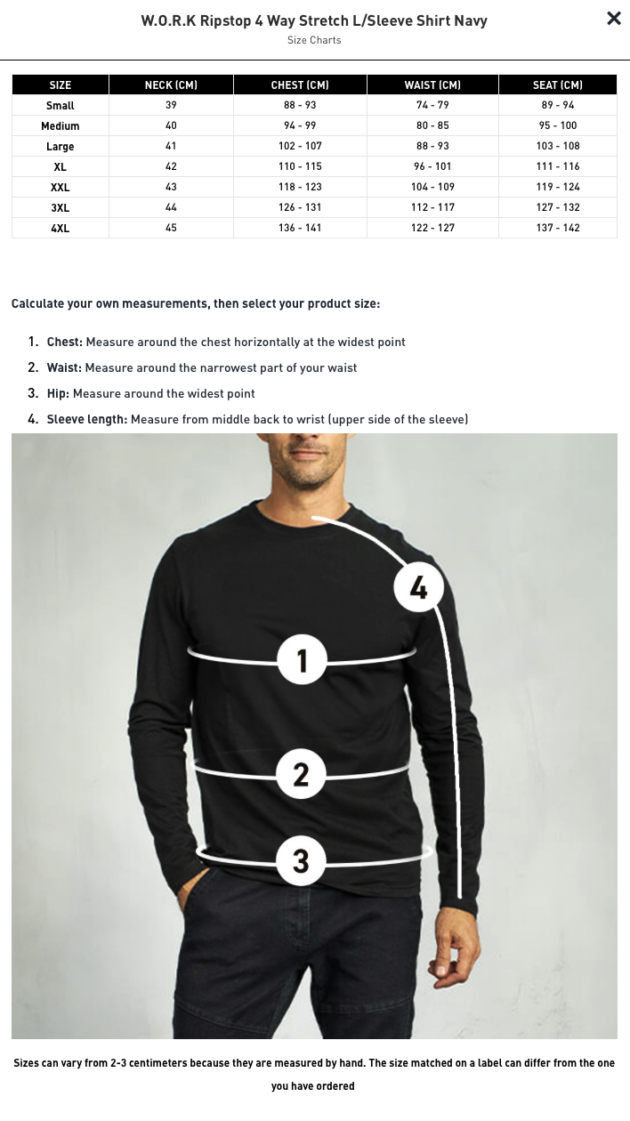 W.O.R.K Ripstop 4 Way Stretch L/Sleeve Shirt Navy: SIZE CHART